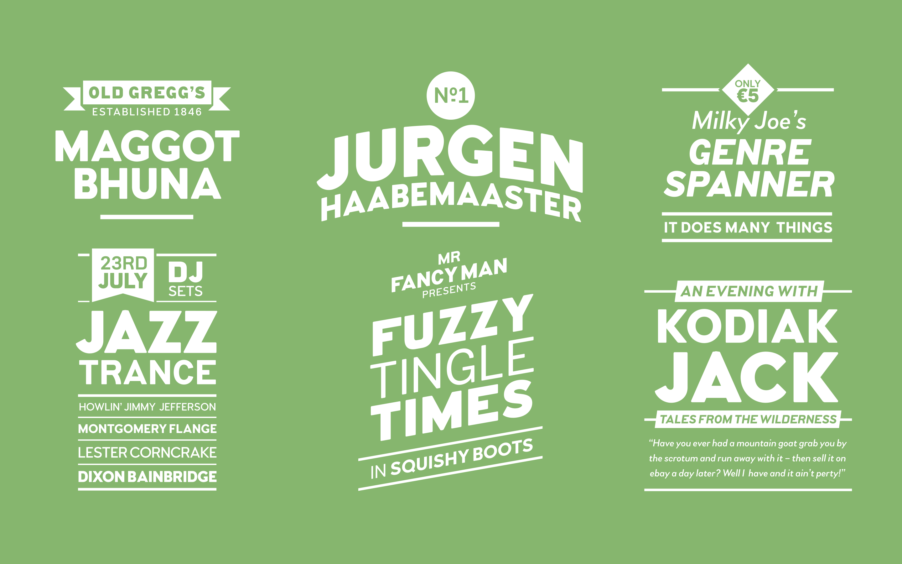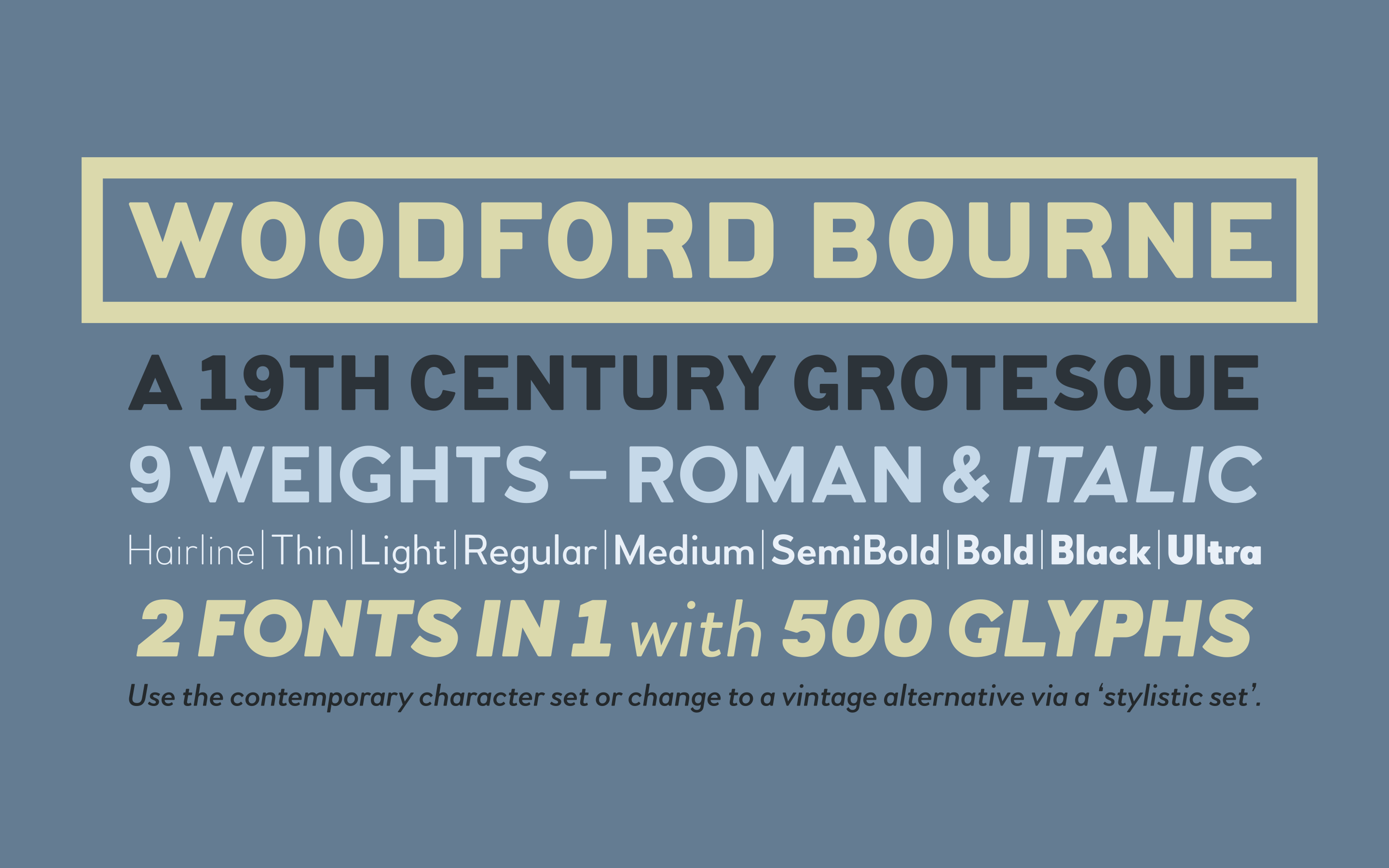 I see Woodford Bourne as primarily a display typeface for titles/headlines in printed materials. I would also love to see Woodford Bourne being used for branding, packaging and promotional material and am keen to hear from designers who use it in their own work.
