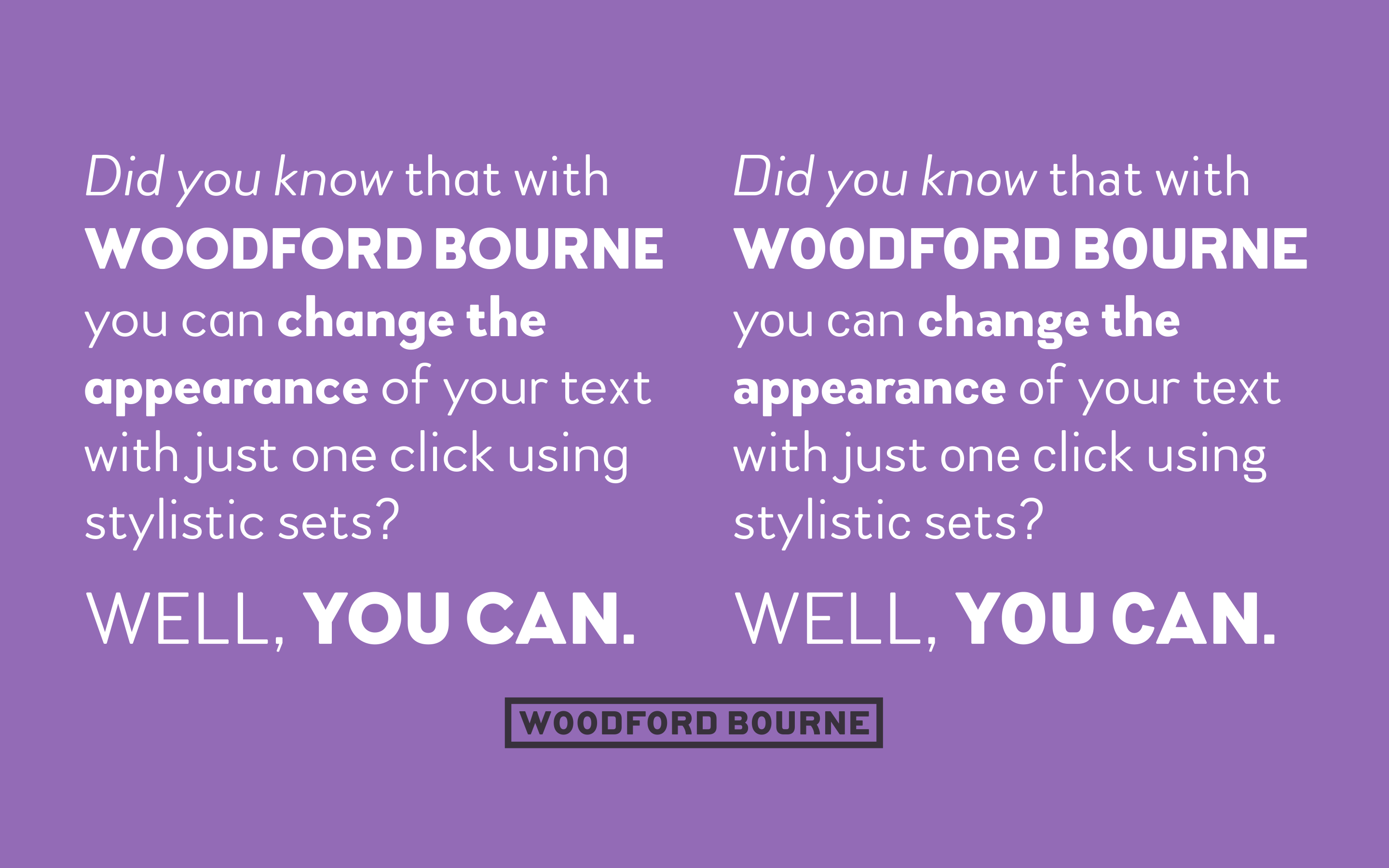 Naturally, the influences for the origins of Woodford Bourne are clear enough, however, I do feel it is important that I reference the work of Tobias Frere-Jones and Mark Simonson in particular for creating Gotham and Proxima Nova. Both have been an influence for Woodford Bourne’s contemporary character forms.